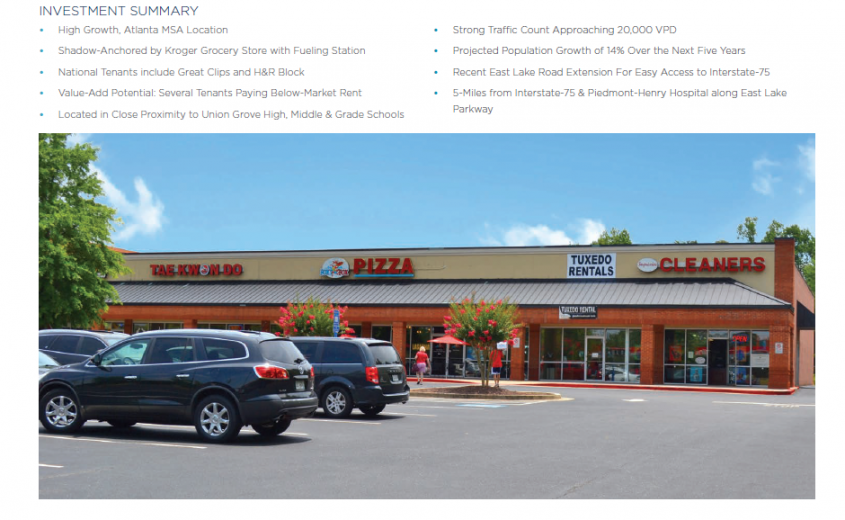 המרכז המסחרי בצומת נורת' מק'דונהו שבעיר מקדונהו (ג'ורג'יה) הינו בשטח של 2,994.6 מ"ר ובתפוסה של 97% שוכרים. המרכז מגוון בשוכרים מסוגים שונים – כדוגמת Great Clips ו – H&R Block. יתרה מזאת, הזדמנות ההשקעה הזו כוללת בתוכה שטח ריק להשכרה עתידית ושוכרים שכיום משלמים מחיר הנמוך מהמחיר בשוק או דמי שכירות ברוטו. המרכז המסחרי נמצא במיקום אסטרטגי בצומת איסט לייק וכביש מהיר מס' 155 בג'ורג'יה. ישנה גישה נוחה למקום וסך טוטאלי של כ-20,000 רכבים חולפים כמדי יום. נראות חזיתית מצוינת ויסודות בניין חזקים. הנכס אינו רק פרה חולבת אלא גם מושך ואטרקטיבי למשקיעים שמבינים את התחום – חוזי השכירות מול הדיירים הם ארוכי טווח.
